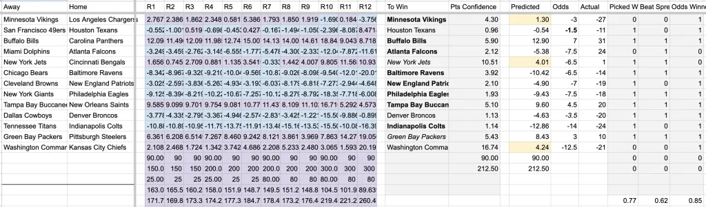 A decent week, with The Model winning 77% vs 85% for vegas odds. The Model beat the spread 62% of the time, which a nice return to form.