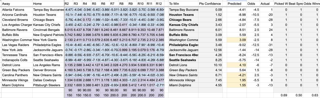 The Model picked the winner 69% of the time vs the Vegas line’s 63%. Winning on 3 of it’s 5 underdog picks helped. Sadly, The Model was just 50% against the spread.