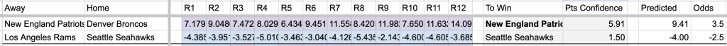 Here are The Model’s picks for the week and then every combo that could happen in the Super Bowl. The Super Bowl games are run with each team as the home team. So you can perhaps average the two rows or do your own thinking to figure out which team should get home field advantage and how much.